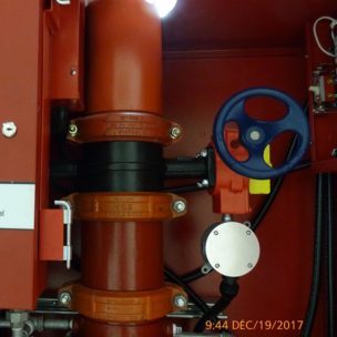 Pour un entretien plus facile, une vanne d’isolement est installée sur la colonne montante. Elle permet aussi des essais à plein débit sans remplissage de la tuyauterie du système. Un verre de visée situé sur le drain principal permet de confirmer visuellement l’écoulement d’eau.